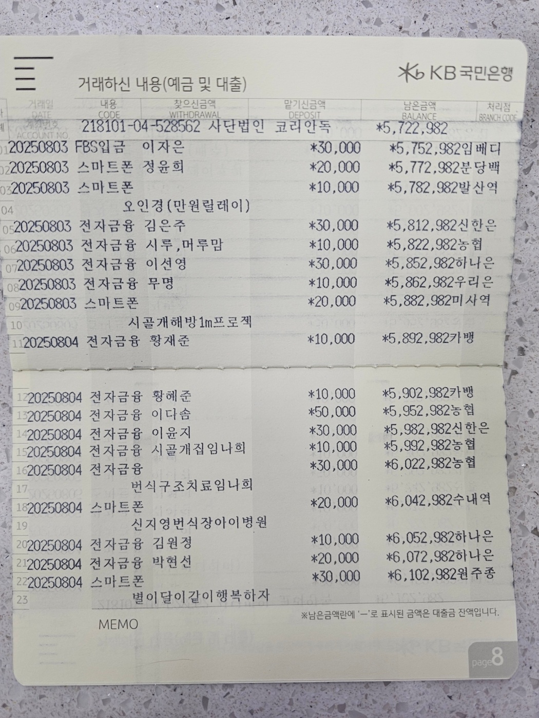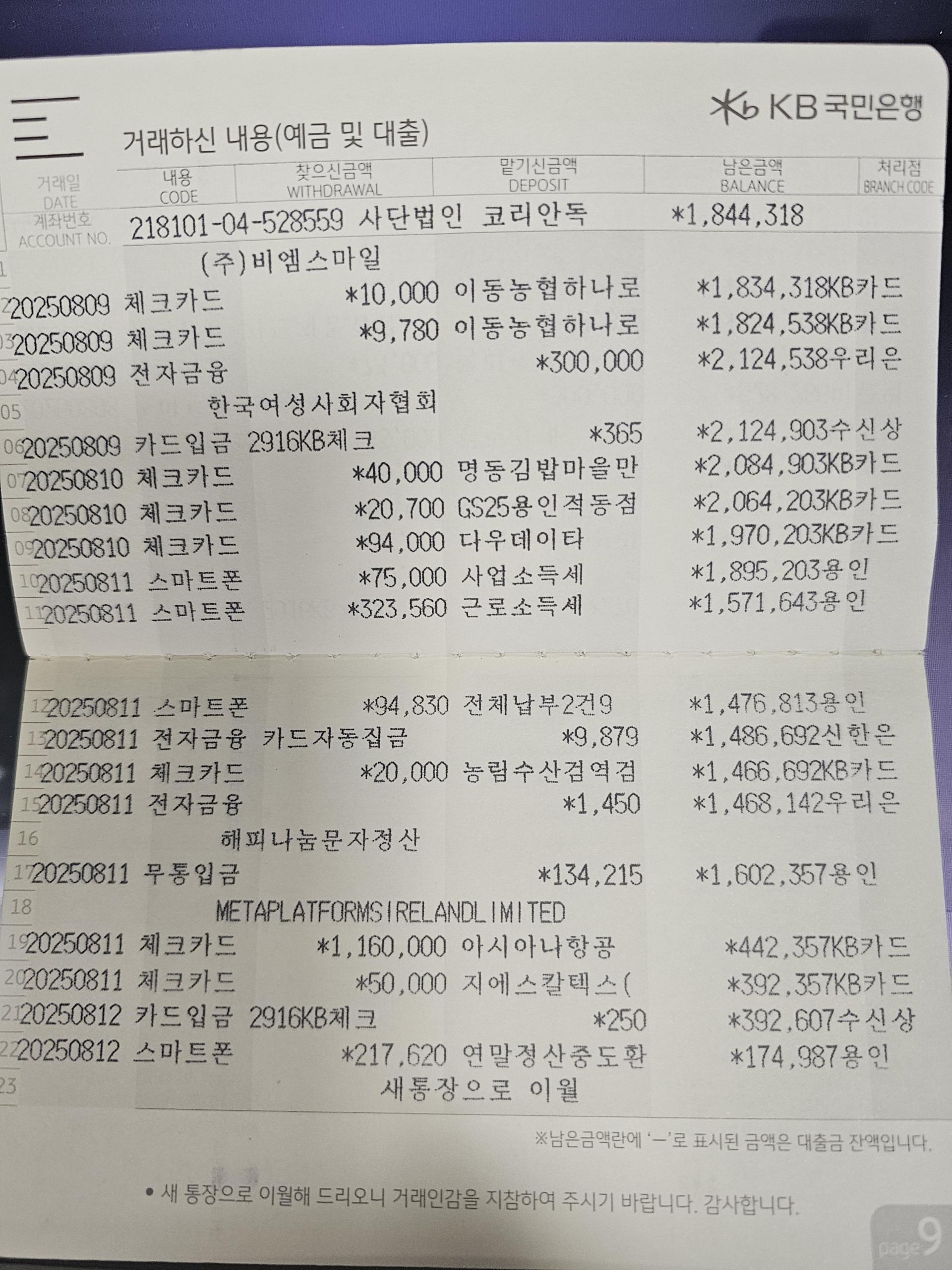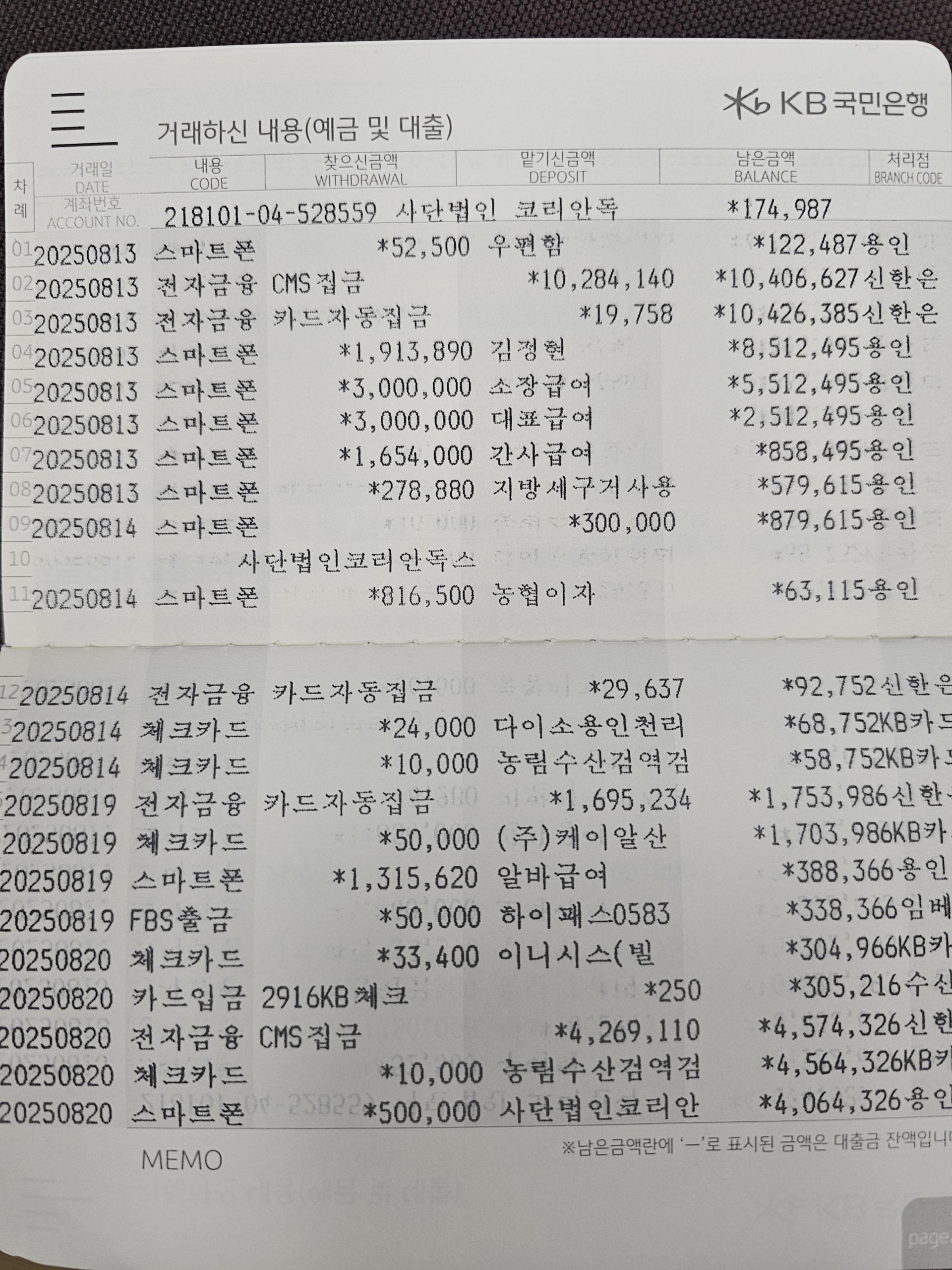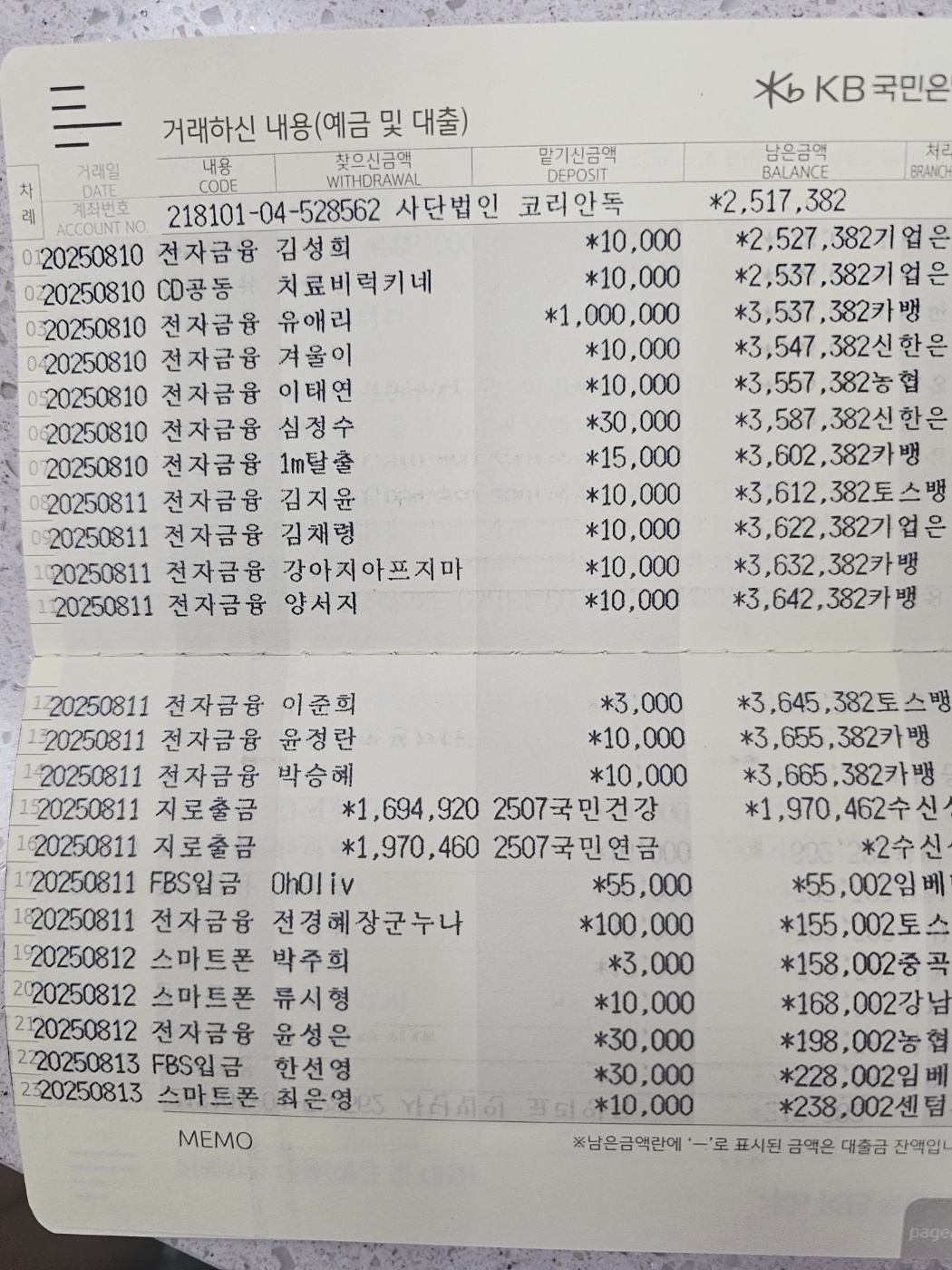사단법인 코리안독스 2025년 8월 통장내역 & 회계보고